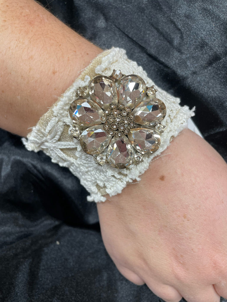 Elevate your style with our Ivory Lace cuffs, featuring a vintage white lace design with a soft velvet underlay. The rhinestone button allows for size adjustment, making it the perfect accessory for any outfit. Experience a touch of elegance and versatility with our lace cuffs.