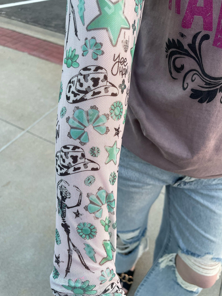 Elevate your Halloween look with our Halloween Yeehaw Mesh Top. This adorable top adds a touch of whimsy to any outfit, making it the perfect addition to your festive wardrobe. With its lightweight and breathable mesh fabric, you can stay comfortable while looking effortlessly cute.