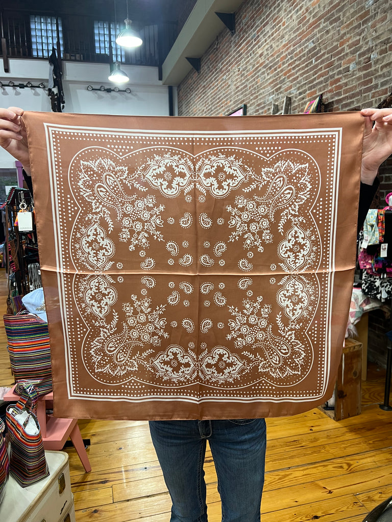 Embrace the wild west with the Small Buffalo Bandana Wild Rags Coffee, a versatile accessory that adds a touch of rustic charm. This paisley print scarf is perfect for tying around your neck, wrist, or even as a headband