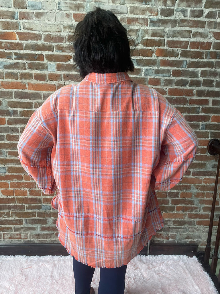 Experience comfort and style with our Coral LS Mineral Washed Plaid Button Up Top. The oversized fit provides a trendy look while the mineral washed fabric makes it extra soft and comfortable. Elevate your wardrobe with this cute and versatile piece.