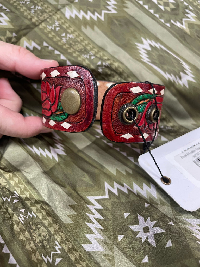 This Floral & Feather Tooled Leather Cuff is a beautiful blend of craftsmanship and style. Each cuff is intricately tooled and hand-painted, making it a one-of-a-kind accessory. The adjustable sizing allows for a comfortable fit for all wrist sizes. Elevate your outfit with this unique and versatile piece.
